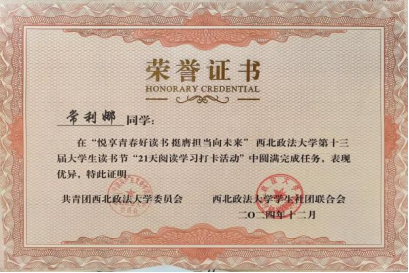 人物介绍:常利娜,女,汉族,共青团员,任西北政法大学学生社团联合会部长、校团委社团文体部兼职副部长、图书馆校刊编辑部成员、学院女足队长、班级心理委员,曾获“三好学生”“优秀共青团员”、国家励志奖学金、校级一等奖学金以及“北仲杯”奖学金等荣誉。