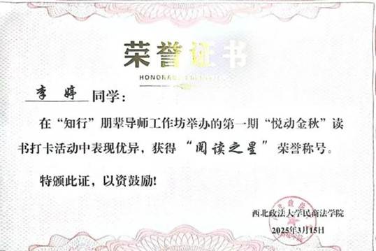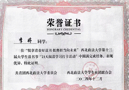 尘雾之微,补益山海;荧烛末光,增辉日月。我担任班级班干部、院学生会宣传部志愿者;班级综测排名第2名,年级综测排名第7名;注册有个人的公众号账号“生与斯长于斯”,发表个人的读书感悟与实践思考,以及对社会热点的看法与认识。并获得西北政法大学第十三届大学生读书打卡优秀证书。同时,我积极参与校园文化建设,获得校园马拉松第 11 名的名次、高校跑团联盟比赛团体第4名的好成绩、获得校园阳光乐跑运动之星荣誉称号、心理季主题活动获得二等奖等,努力为校园文化建设贡献个人力量。