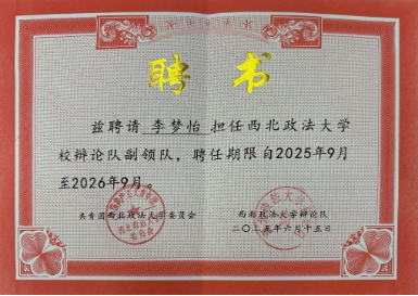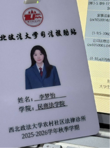李梦怡,女,汉族,共青团员,西北政法大学2023级民商法学院学生。现任2023级民商法2班学习委员、西北政法大学校辩论队副领队、西北政法大学经济法学院《青年法苑》学生编辑、民商法学院辩论队领队、同时担任沐心调解工作室、法途指引工作坊成员。曾获国家励志奖学金、“三好学生”、“优秀共青团员”、“优秀实习生”、第四届“金唐杯”法治与文化主题辩论邀请赛省级优秀志愿者、第十一届全国大学生模拟法庭竞赛全国一等奖、“理律杯”模拟法庭全国三等奖等多项荣誉,以扎实的专业能力和饱满的热情书写青春答卷。
