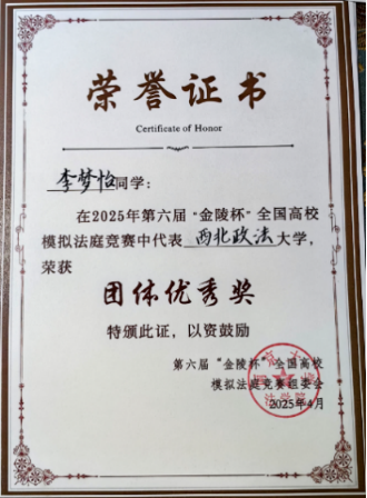 感恩于心,履责于行。国家与学校的资助不仅为成长之路保驾护航,更让我深刻体会到青年一代肩负的责任与使命。在实践中锤炼本领,在服务中践行初心,成为我不变的追求。 实习期间,我于2025年7月-8月在西安市灞桥区人民法院参与实习,期间参与庭审记录、拟写法律文书、整理案卷材料,累计记录案件相关表格9份,拟写法律文书20余份,以严谨认真的态度赢得实习单位高度认可,成功入选优秀实习生推荐名单。此外,我有幸参与诊所法院值班,将课堂所学转化为实践能力,在直面群众法律需求的过程中,深化了对法律职业的认知与坚守。 公益路上,我始终步履不停。在第四届“金唐杯”法治与文化主题辩论邀请赛中获评优秀志愿者,用实际行动传递法治温度。在奉献中收获成长,在担当中共筑温情。