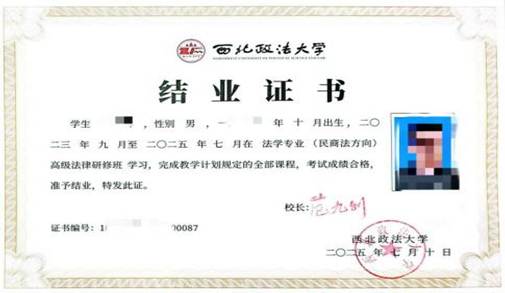 按教学计划修完规定课程且成绩合格者即可结业,颁发“西北政法大学高级法律研修班结业证书”,证书统一编号,加盖学校钢印、校印及校长印。