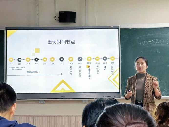 刘洋老师细致梳理了升学和择业的关键时间节点,并逐一讲解了各个阶段的核心任务,为同学们提供了清晰的学业指南。同时,她详细分析了当前我校考研的整体形势,鼓励同学们放平心态,持续养成良好的备考习惯,理性做出最适合自己的选择。
