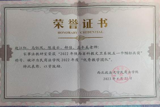 家事法教研室党支部依托学院家事法教研室组建成立,是学院首个师生共建型党支部。2018年,支部被评为陕西省巾帼英雄集体;2022年,家事法教研室荣获陕西省教科文卫系统五一巾帼标兵岗荣誉称号;2022年、2023年,被评为优秀党支部。2022年,支部党员教师陈凌云获得西北政法大学青年教学名师称号;2024年,支部党员教师郝佳荣获西安市三八红旗手称号。近年来,支部党员教师主持并完成国家社科基金4项,获得省部级教学科研奖6项,发表核心期刊论文20余篇,指导学生参加全国各级竞赛获奖10余项。
