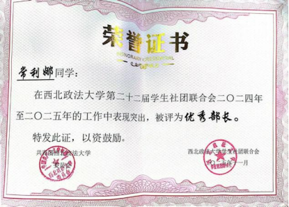 身兼多职的成长路上,国家资助传递的责任理念、学校依托资助体系搭建的多元实践岗位,是我践行青春使命的重要依托。国家资助不仅是物质帮扶,更注重培育学子的责任担当。学校落实这一要求,为学子提供学生工作、志愿服务、实习实践等多元岗位,让我在履职中锤炼本领,以实干回馈帮扶。班级工作中,作为心理委员,我密切关注同学们的心理状态,牵头推动班级建设,助力班级荣获2023-2024年“三好班集体”、本科生晨读晨练活动“优秀班集体”等荣誉;作为女足队长,我带领队员刻苦训练、精心统筹赛事安排,凝聚团队向心力,在各类赛事中屡创佳绩,以担当扛起团队责任。校园工作中,学校资助育人体系对学生干部的培育扶持,让我在岗位上稳步成长,担任学生社团联合会监察部部长期间,我统筹协调部门事务,高效落实各项任务,荣获“优秀干部”“优秀干事”“每月之星”等多项荣誉,在“五四”表彰大会中获评“先进个人”,且为第十五期大学生骨干培训班优秀学员;任职图书馆馆刊编辑部编辑时,我凭借扎实的文字功底,认真完成馆刊校对、排版工作,获评“优秀编辑”;作为校团委社团文体部兼职副部长,我全力配合老师统筹各类校园活动,以严谨细致的态度确保工作顺利落地。此外,我积极投身实践服务,累计参与志愿服务200余次、团课活动30余次,在第三十一届校园文化艺术节歌手大赛中获评“优秀志愿者”,以实际行动践行服务初心,传递青春温暖。