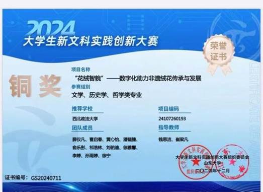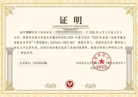 有一份热,发一份光。青年努力奉献,让奋斗洪流汇聚在新时代,让有为之花绽放在新时代。在科研实践方面,我积极参与2024、2025年新文科大赛,并获得校级金奖、国家级铜奖、优秀奖项;在2025挑战杯比赛中获得省级三等奖;2025年大学生AI赋能挑战赛省级三等奖;十五届全国大学生“三创赛”挑战赛校级一等奖;第一届人工智能大赛校级三等奖;西南政法大学与南方科技大学廉洁研究所“全国一线城市廉洁指数综合评价”课题项目优秀证书。