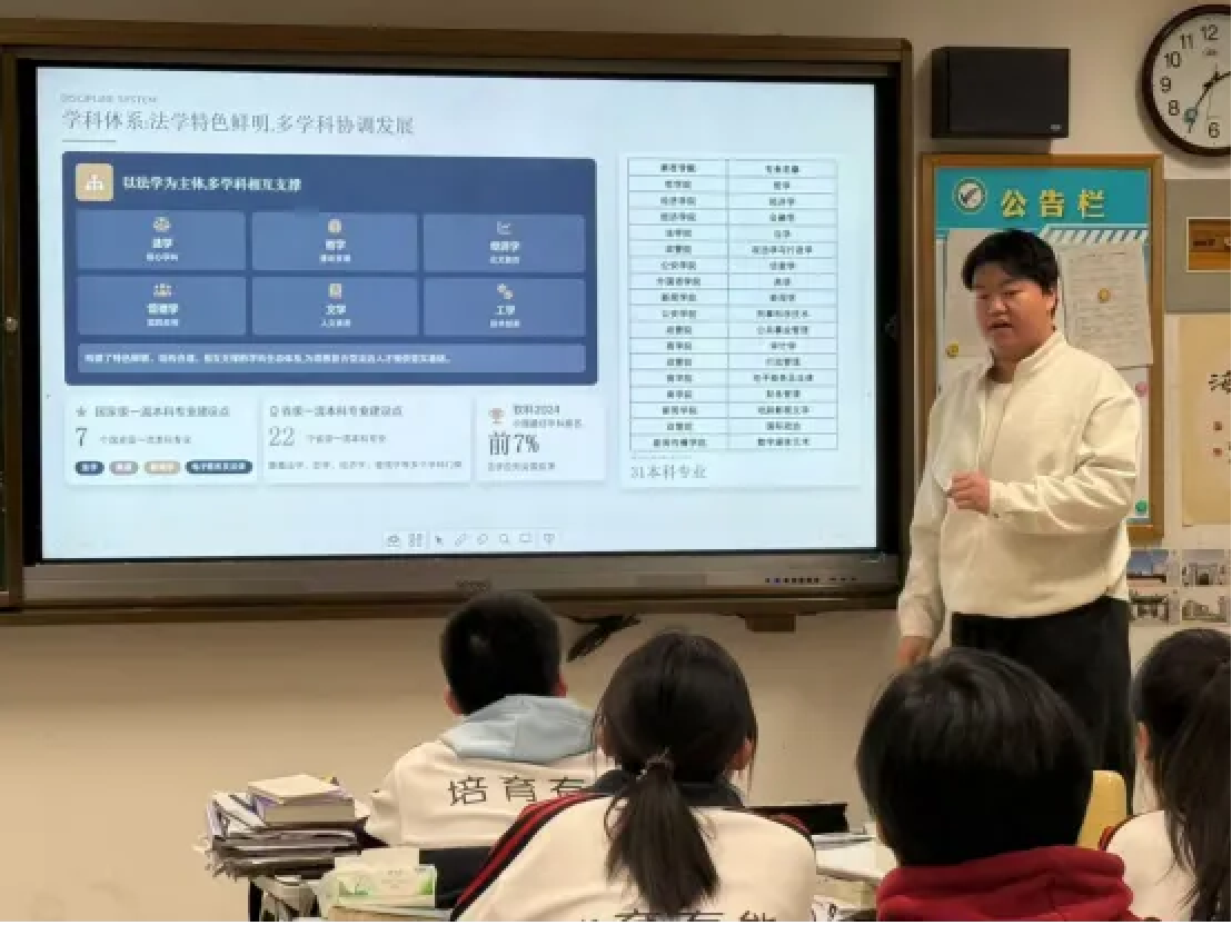 宣讲中,同学们系统介绍了学校人才培养模式、课程体系设置以及模拟法庭、学科竞赛、志愿服务等实践平台,帮助高中学子更加直观地理解大学学习节奏与成长空间。